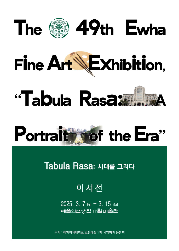 타불라 라사(Tabula Rasa)는 '빈 서판(empty tablet)'을 뜻하는 라틴어이며, '빈 서판'이란 분필 등으로 글씨를 썼다가 지울 수 있도록 만든 평평한 판에 아무런 글씨가 없는 상태를 의미한다. 이 단어는 17세기 영국의 철학자 존 로크(Johin Locke)가 자신의 경험주의 철학을 설명하기 위해 사용한 개념으로 로크는 인간의 마음이 태어날 때부터 아무런 지식이나 관념이 없는 상태. 즉 타불라 라사와 같으므로 후천적인 경험과 교육이 중요함을 강조하였다. 로크의 생각처럼 교육과 환경이 개인의 인식과 지식 형성에 지대한 역할을 하는 것이 맞다면, 2025년 3월 7일-15일에 예술의전당 한가람미술관에서 열리는 <Tabula Rasa: 시대를 그리다>는 이화여자대학교 서양화과가 서로 다른 시대와 세대를 거치며 살아온 동문들에게 어떤 경험과 교육을 제공하였고, 그것이 각자의 개인 정체성과 전문성을 형성하는데 어떤 역할을 하였는지 돌아보는 자리임을 강조한다.